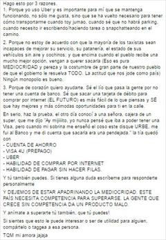 1. Porque yo uso Uber y es importante para mí que se mantenga funcionando, no sólo me gusta, sino que se ha vuelto necesario para tener cómo transportarme cuando toy jumao, cuando sé que no habrá parking, cuando necesito ir escribiendo/haciendo tarea o snapchatteando en el camino.
